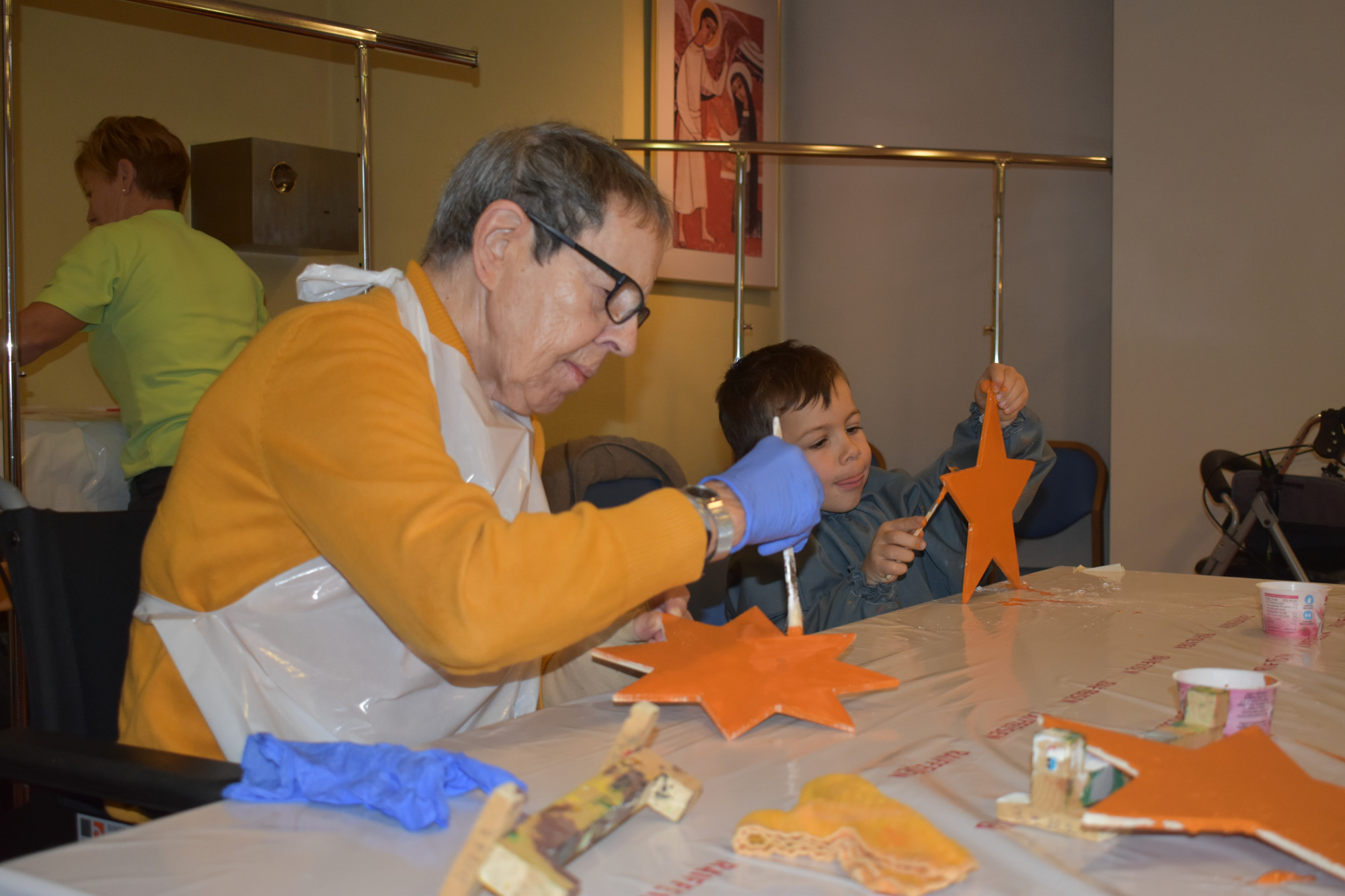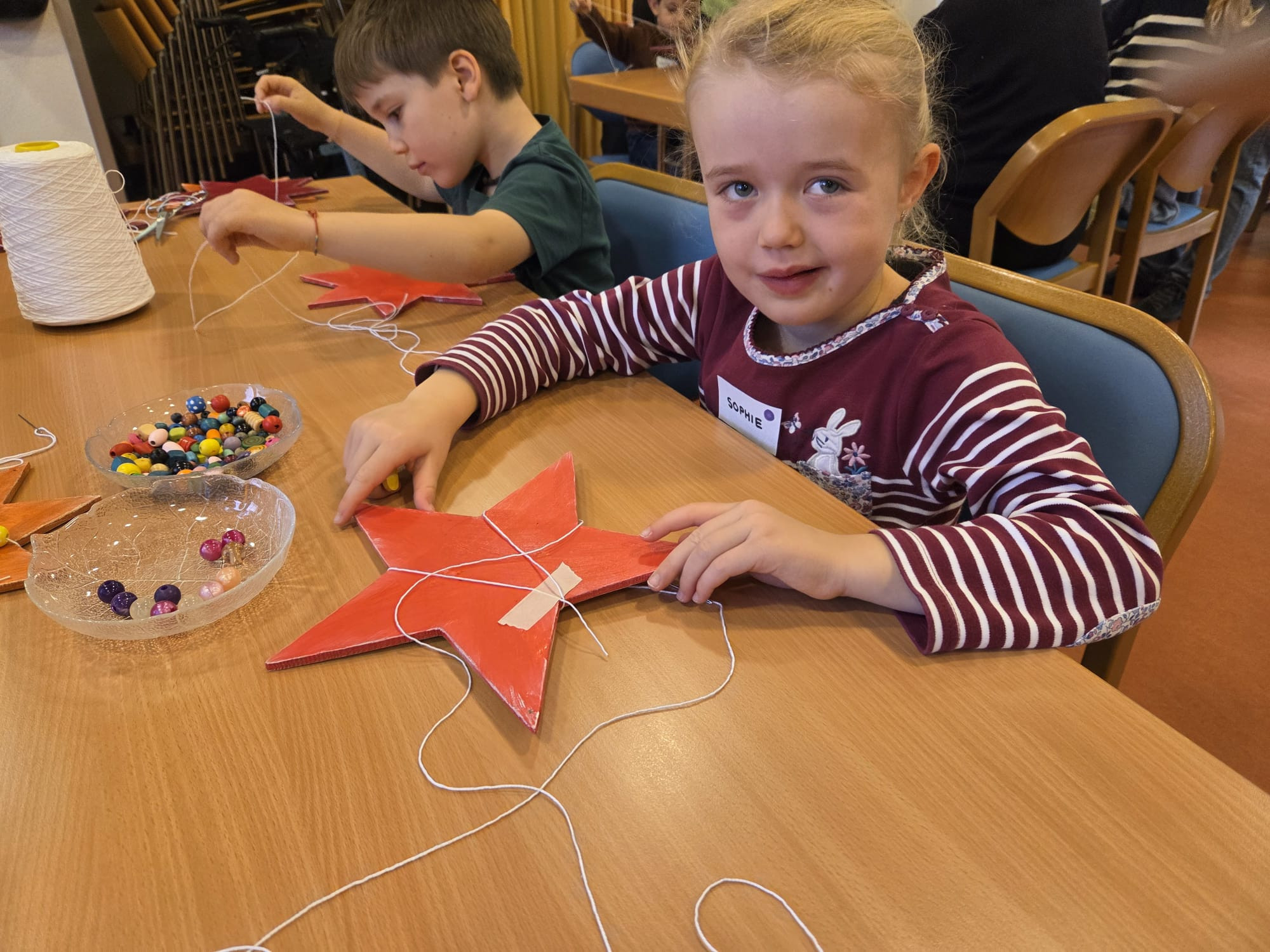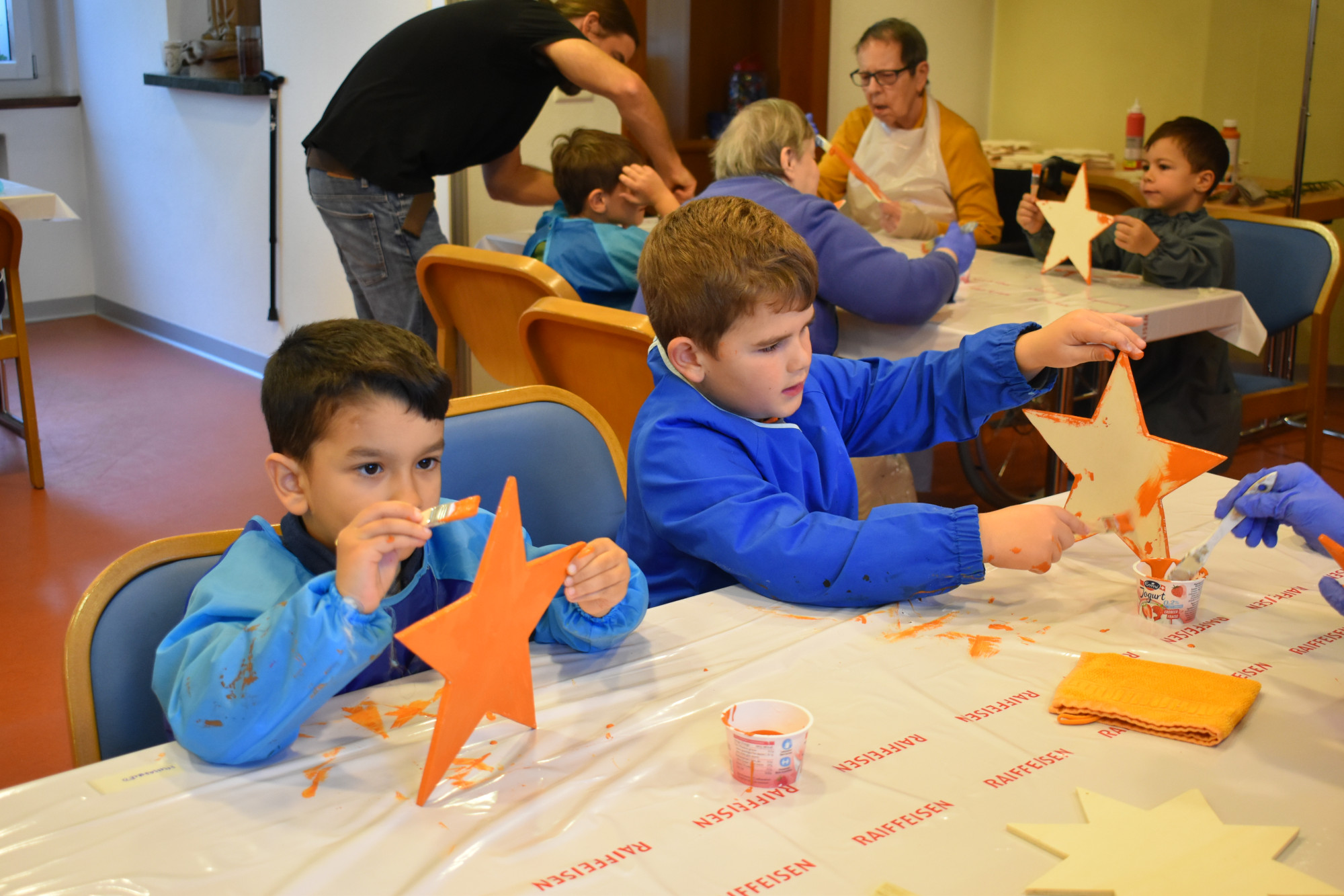 Beim ersten Treffen bemalten wir nach einem kurzen Kennenlernspiel die vorbereiteten Sterne. Beim zweiten Besuch wurden sie dann verziert – es wurde gelacht, erzählt, geholfen aber auch ganz konzentriert gearbeitet. Das dritte und letzte Treffen bildete einen stimmungsvollen Abschluss: Gemeinsam spazierten wir von der Seerose zum geschmückten Weihnachtsbaum der Gemeinde, wo ein kleiner feierlicher Akt stattfand, der das Projekt wunderbar abrundete.