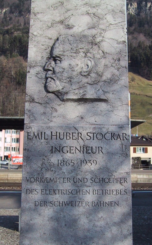EMIL HUBER-STOCKAR ENTWICKELTE UND ERPROBTE VON 1902-1909 AUF DER VERSUCHSSTRECKE SEEBACH-WETTINGEN AUS EIGENER INITIATIVE DIE TECHNISCHEN GRUNDLAGEN DES ELEKTRISCHEN BETRIEBES DER SCHWEIZER BAHNEN / UEBERLEGEN UND MIT ZAEHER ENERGIE PLANTE UND LEITETE ER DIE ELEKTRIFIZIERUNG DER GOTTHARDLINIE UND ANDERER HAUPTSTRECKEN DER BUNDESBAHNEN / SEIN NAME BLEIBT MIT DIESEM GROSSEN WERK DER TECHNIK VERBUNDEN