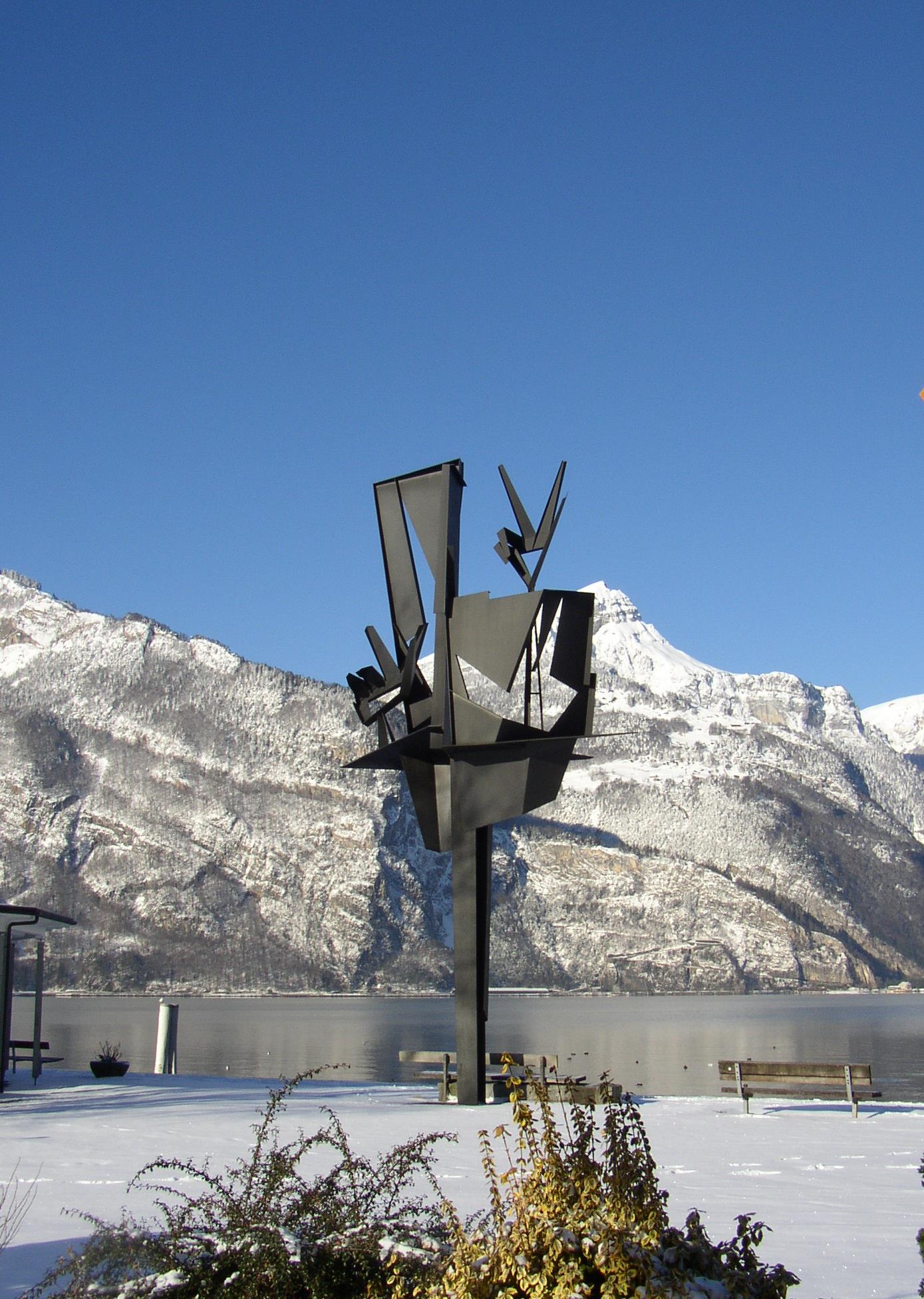 Der Berner Künstler Werner Witschi (1906-1999) schuf für die Expo 1964 in Lausanne eine zeitgemässe moderne Eisenplastik mit dem Titel "Schwurhände". Das Kunstwerk war 1964 an der Expo in Lausanne aufgestellt und wurde von der Stadt Lausanne dem Kanton Uri geschenkt. Anlässlich der Tellspielpremiere wurde die 11 Meter hohe und zirka 5 Tonnen schwere Plastik vom Lausanner Stadtpräsidenten und späteren Bundesrat, Georges André Chevallaz, dem Kanton Uri am 3. Juli 1965 offiziell übergeben. Die "Schwurhände" sind Symbol der Einigkeit und der Viersprachigkeit der Schweiz. Die vier Hände sollen die vier Sprachen der Schweiz darstellen. Mit der Eisenpastik "Schwurhände gelangte Witschi zu allgemeiner Bekanntheit Werner Witschi wurde 1906 in Urtenen bei Bern geboren. Der Künstler machte seit den sechziger Jahren mit bewegten Eisenplastiken von sich reden. Er war als Sekundarlehrer und dann als Zeichenlehrer tätig, bevor er sich 1971 ganz der Kunst widmete. 1993 wurde eine Stiftung gegründet, die in Bolligen zur Schaffung eines kleinen Witschi-Museums geführt hat. Werner Witschi starb am 24. Dezember 1999 im Alter von 93 Jahren in Bolligen bei Bern.